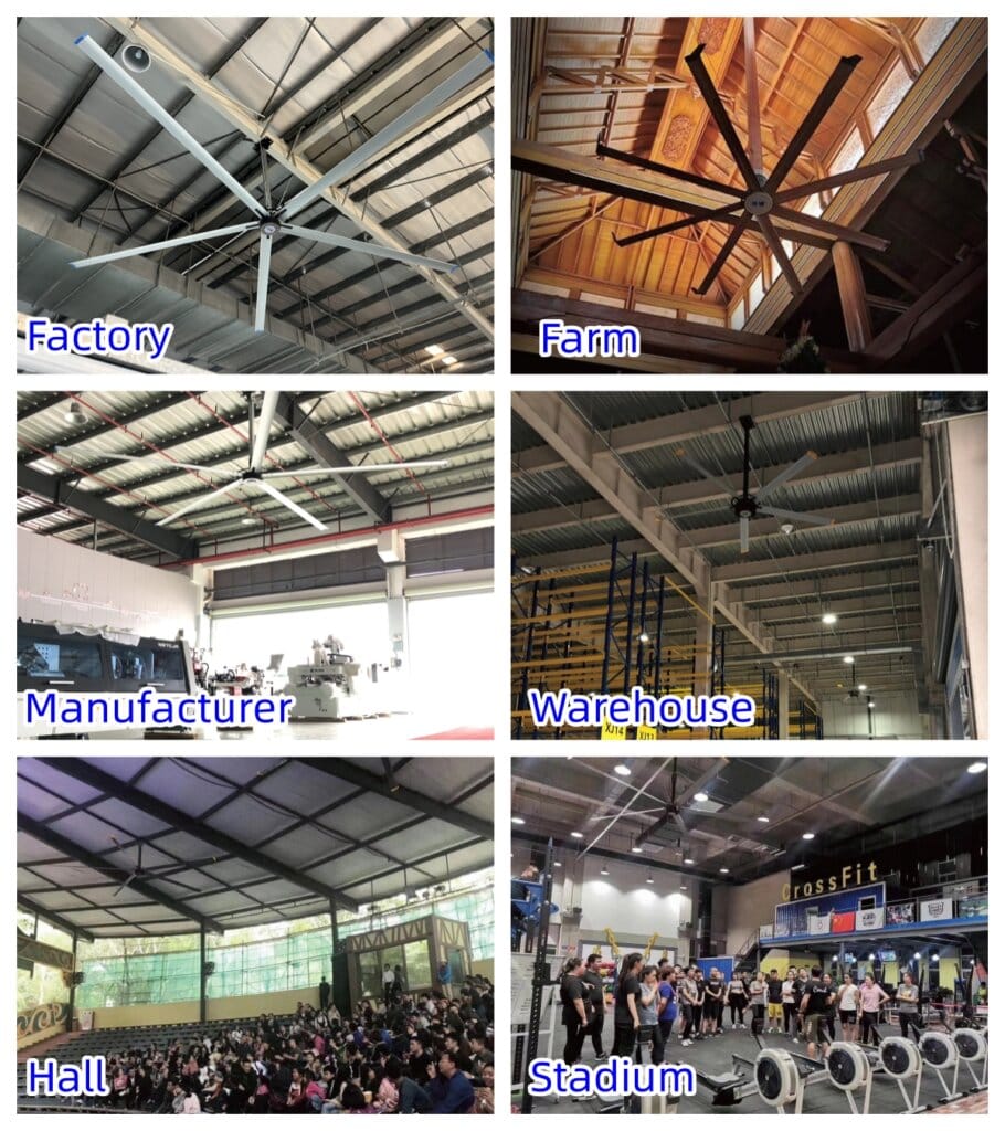 HVLS fans circulate air gently but effectively. This makes them ideal for industrial spaces like manufacuring plant and warehouses, where good ventilation is key. They’re also popular in playgrounds, temples, and event halls for better air quality and comfort.